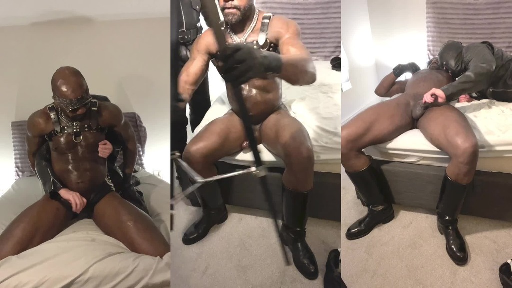 interracial bdsm: leather clad sub ordered to worship black muscle dad