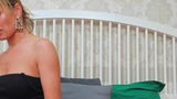 A blonde MILF stands on a grand staircase, dressed in a glamorous evening gown that hugs her curves perfectly.