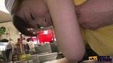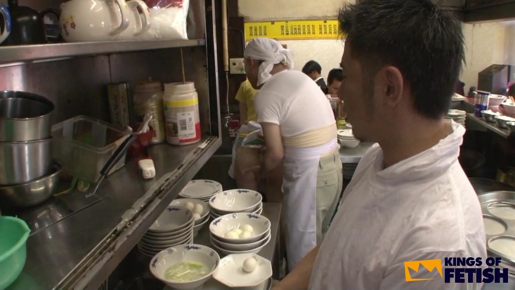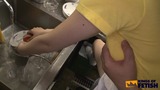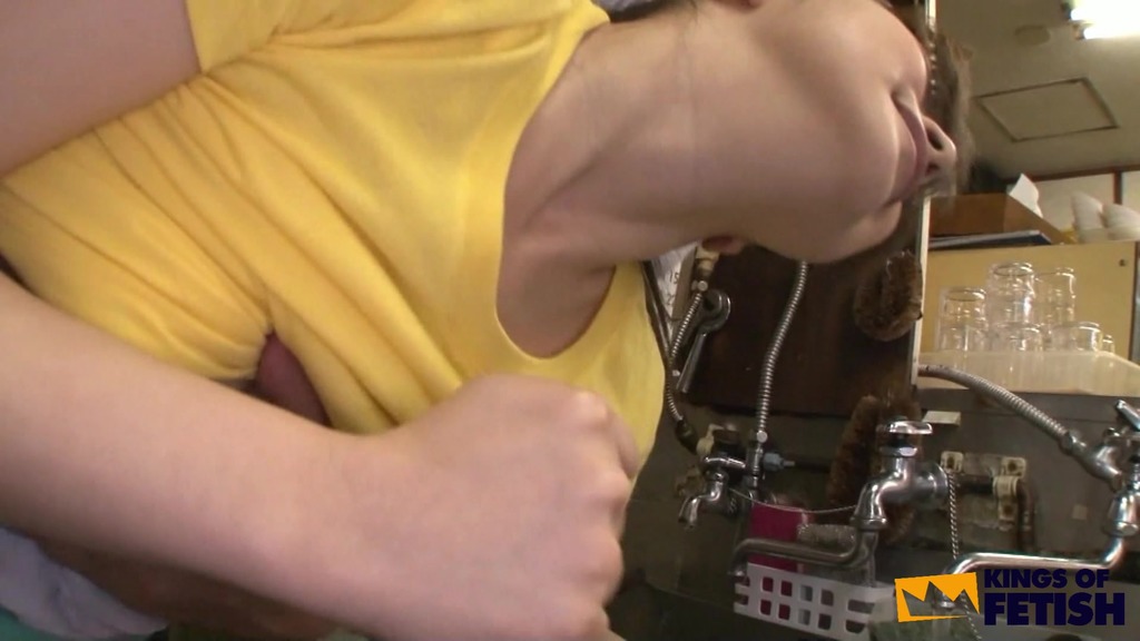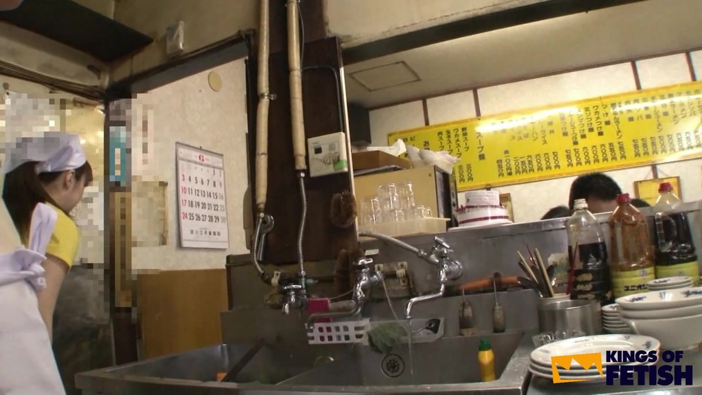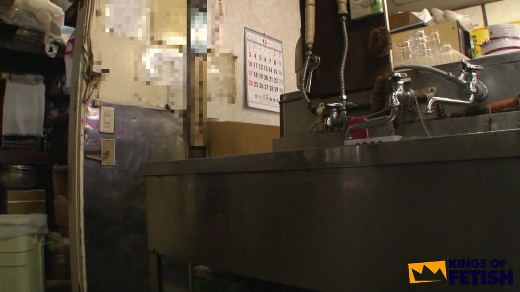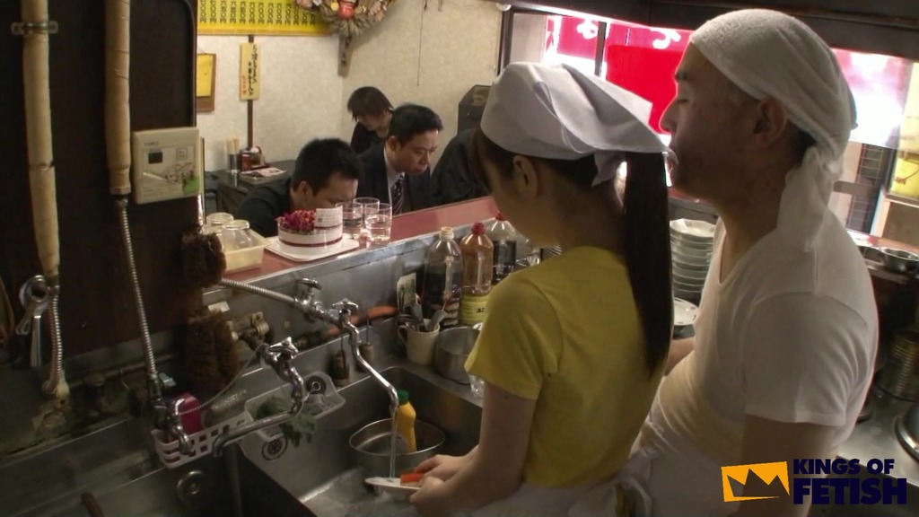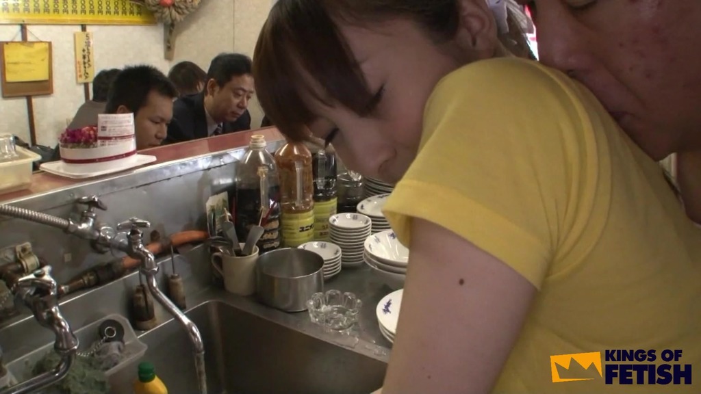 Japanese babe wash dishes in a restaurant and gets bush screwed by her colleagues in front of clients